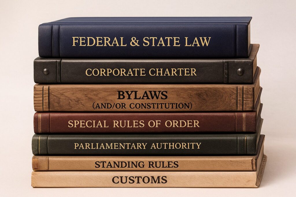 When conducting a board meeting—whether it’s for an HOA, nonprofit, or other organization—it’s critical to understand which rules take precedence when interpreting decisions, enforcing procedures, or resolving disputes. Under Robert’s Rules of Order, Newly Revised (RONR), there is a well-defined hierarchy that determines which governing document or authority controls in any given situation.